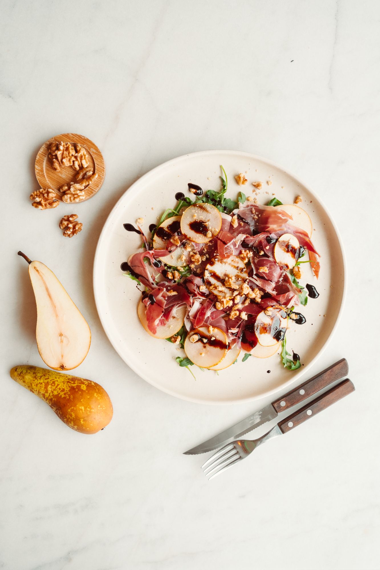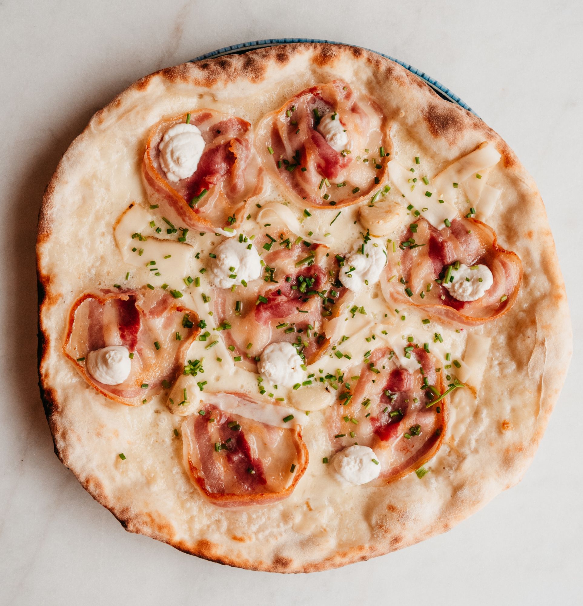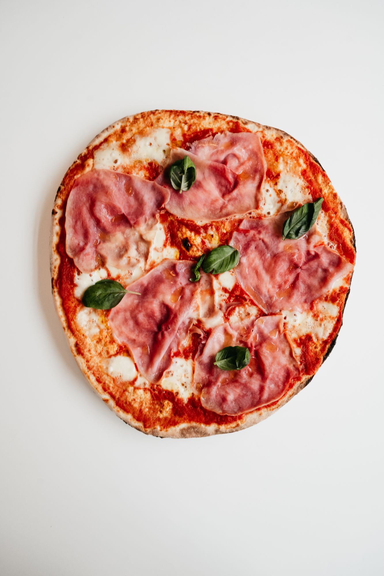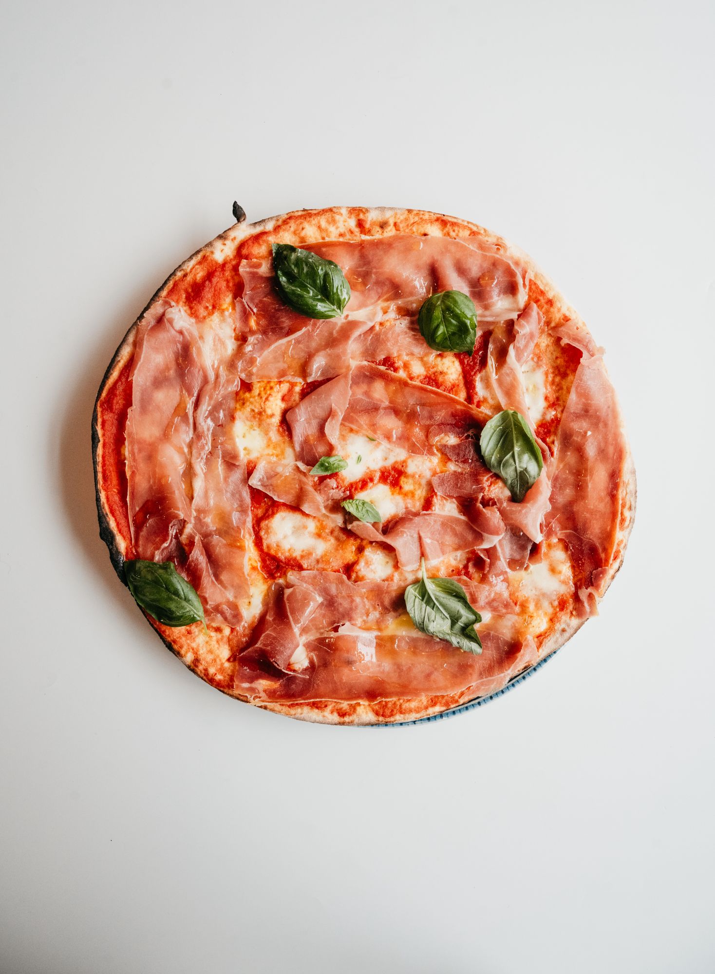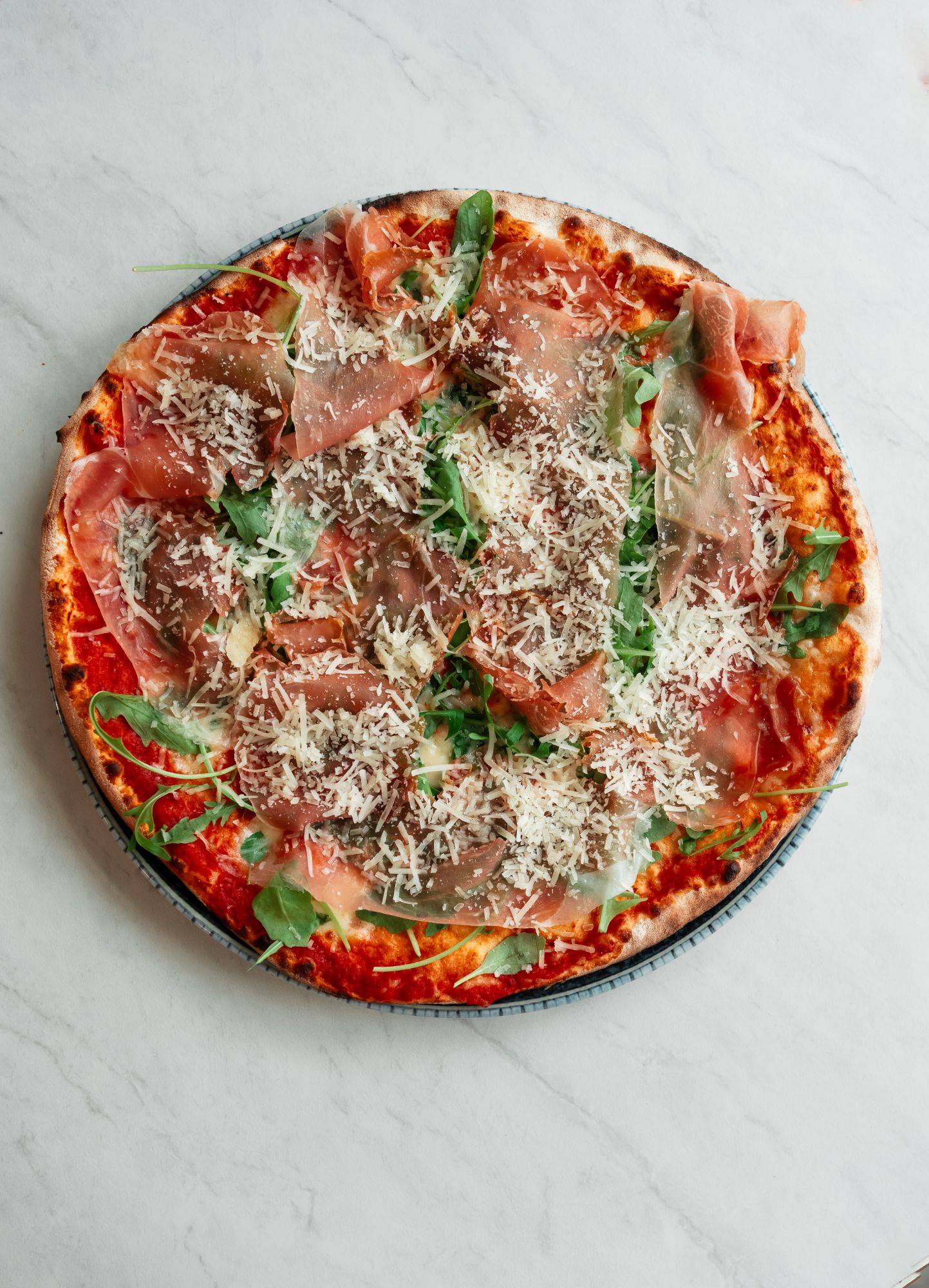 pomidory pelati, mozzarella fior di latte, szynka wędzona speck, mascarpone, rukola, krem balsamiczny -