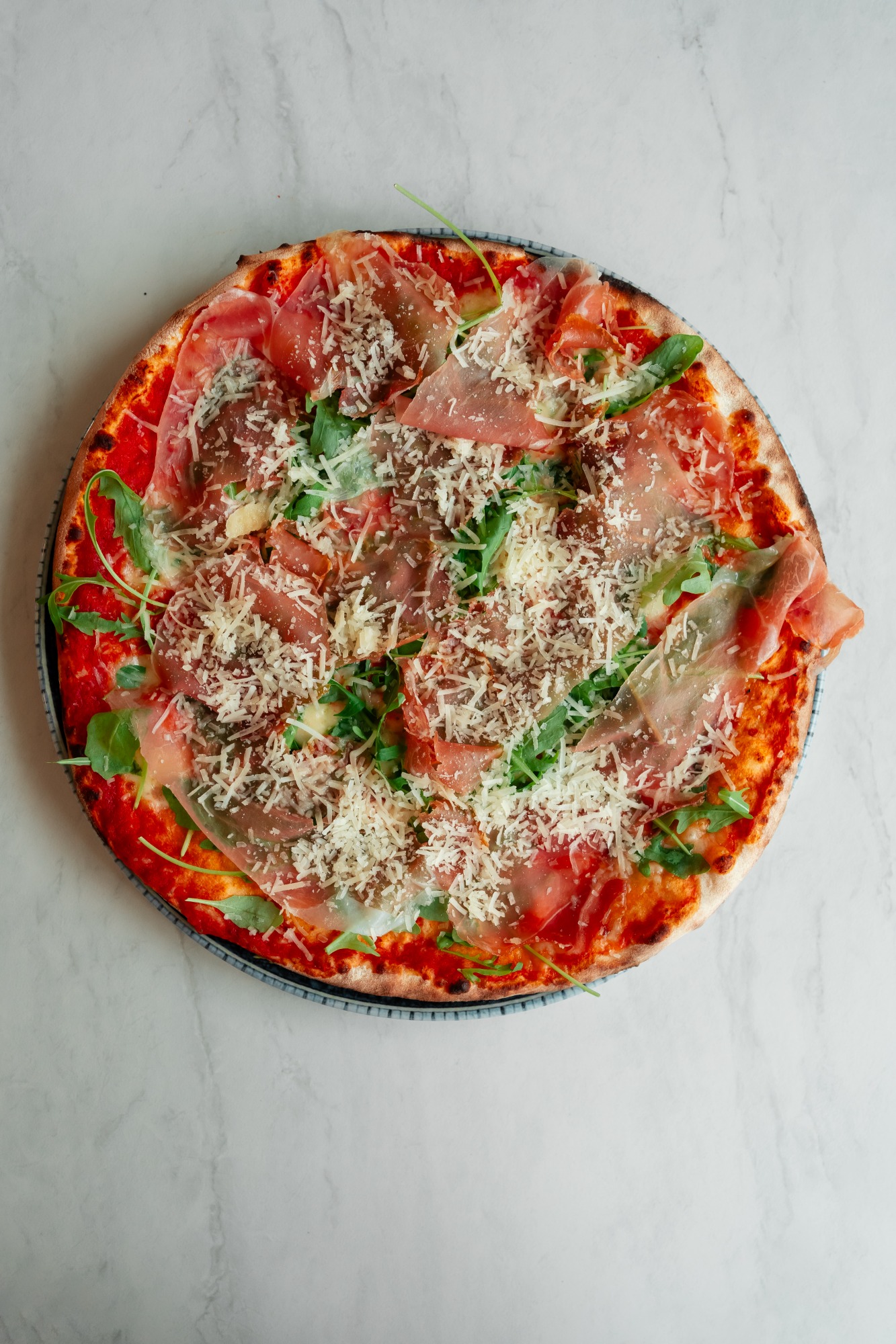 pomidory pelati, mozzarella fior di latte, prosciutto crudo (szynka długodojrzewająca), bazylia -