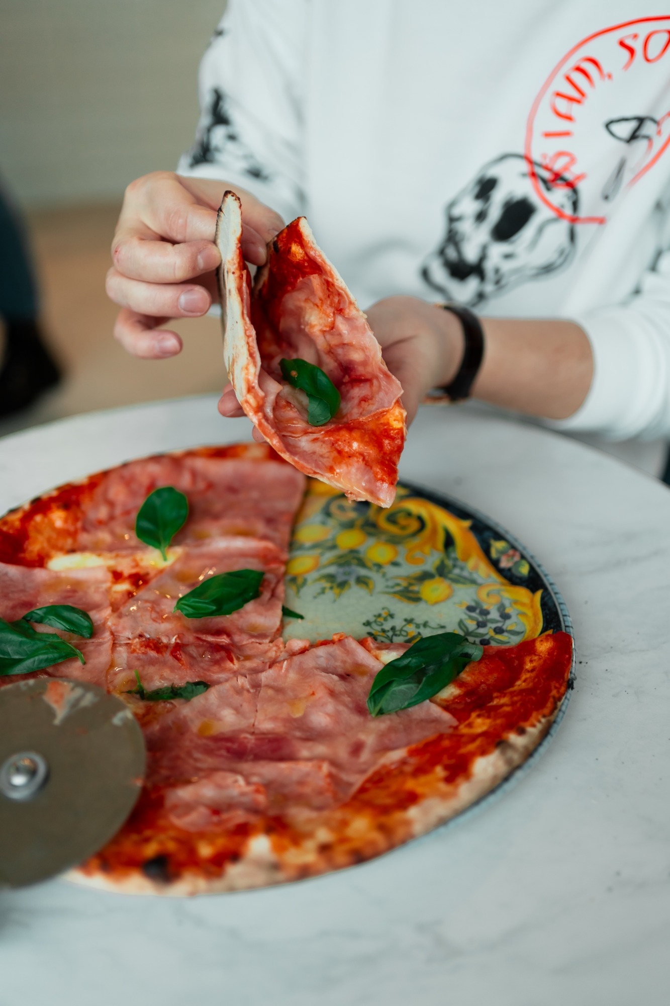 Na każdej części pizzy inne składniki: pomidory pelati, mozzarella fior di latte, pieczarki, oliwki kalamon, grillowane karczochy, prosciutto crudo (szynka długodojrzewająca), jajko, bazylia -
