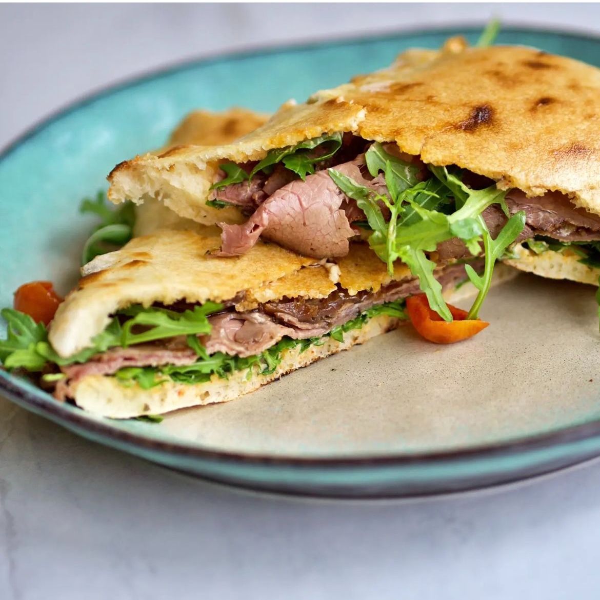 pomidory pelati, mozzarella fior di latte, rostbef wołowy, rukola, sos estragonowy, cebulka piklowana